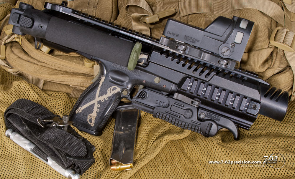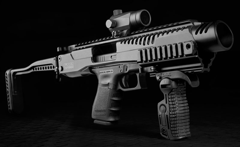 The KPOS is an aluminum chassis in which a pistol is installed. The pistol is held securely by its front rail and by the back of the frame. The function of the pistol is unchanged, so the system builds on the already proven reliability of the pistol. All controls remain the same, except for charging, which is accomplished by a built-in AR-15-style charging handle in the Gen 2 KPOS or a side charging handle installed on the slide of the pistol in the Gen 1 KPOS. The KPOS has top, side, and bottom rails that can be used to install optics, sights, lights, lasers, or foregrips. The KPOS is the only pistol-to-carbine conversion system that supports the pistol by both the front and rear of the frame and that is designed for serious security use. The stock folds to the side for compactness when carried. The fore grip is designed so that when folded, it can be extended to cover the trigger for safety. Unfolding the grip exposes the trigger, or touching a button on both sides will retract the trigger shield instantly, allowing access to the trigger.