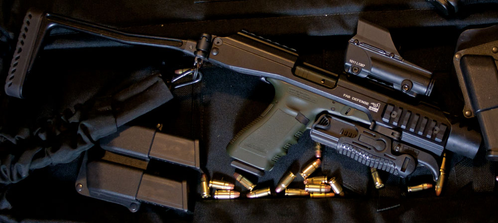 The folding, trigger-safety foregrip works very well. It is easy and intuitive to use. It is not included with the KPOS Pathfinder, but can be purchased separately. The latch mechanism can be disassembled, the spring removed and replaced with a short piece of pipe, and some epoxy applied prior to installing the screw again, locking the trigger shield in the folded positions so that it cannot be used as a foregrip, but can be used as a safety on the Pathfinder. When shooting either the Gen 1 or Gen 2 versions (both standard and Pathfinder), I find them to be very comfortable and natural to aim and shoot, effective, and reliable. They are an excellent choice for school resource officers, or any other security personnel that need a discreet, easily carried carbine. KPOS G2 Glock carbine The KPOS system is manufactured by FAB Defense in Israel and is imported to the US by The Mako Group. We recommend that LE agencies contact the Mako Group for law enforcement pricing. www.themakogroup.com