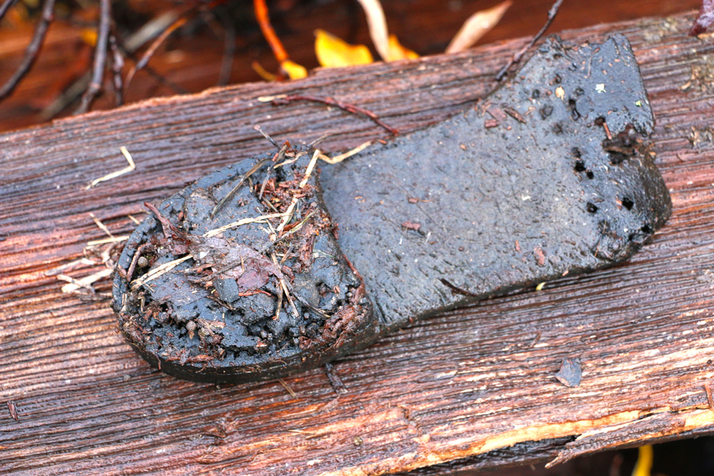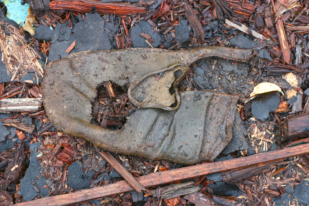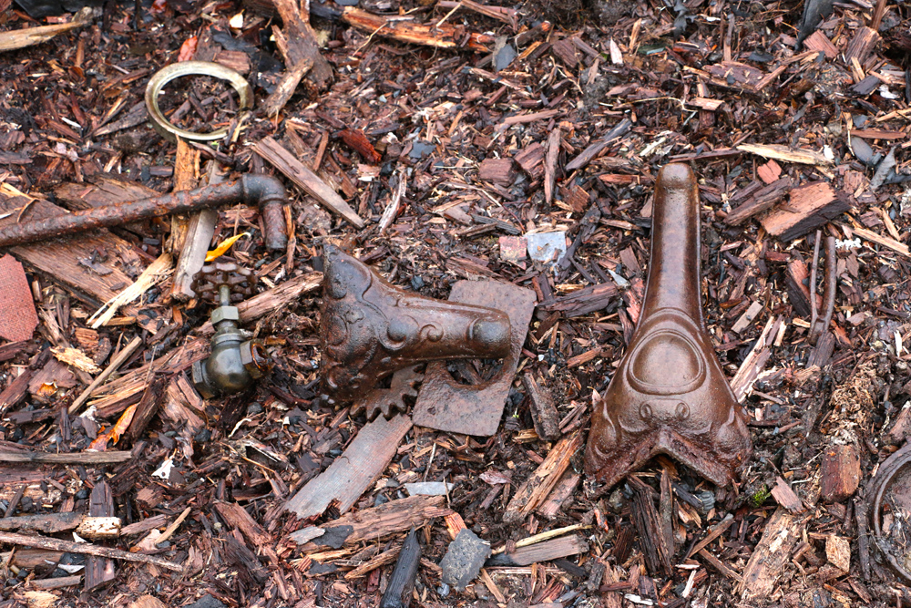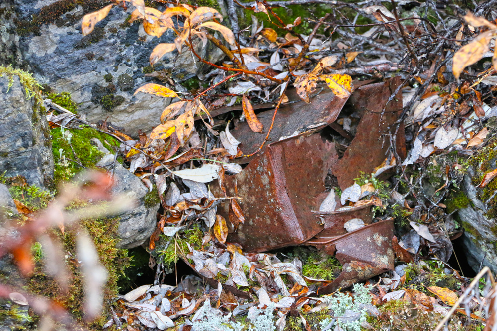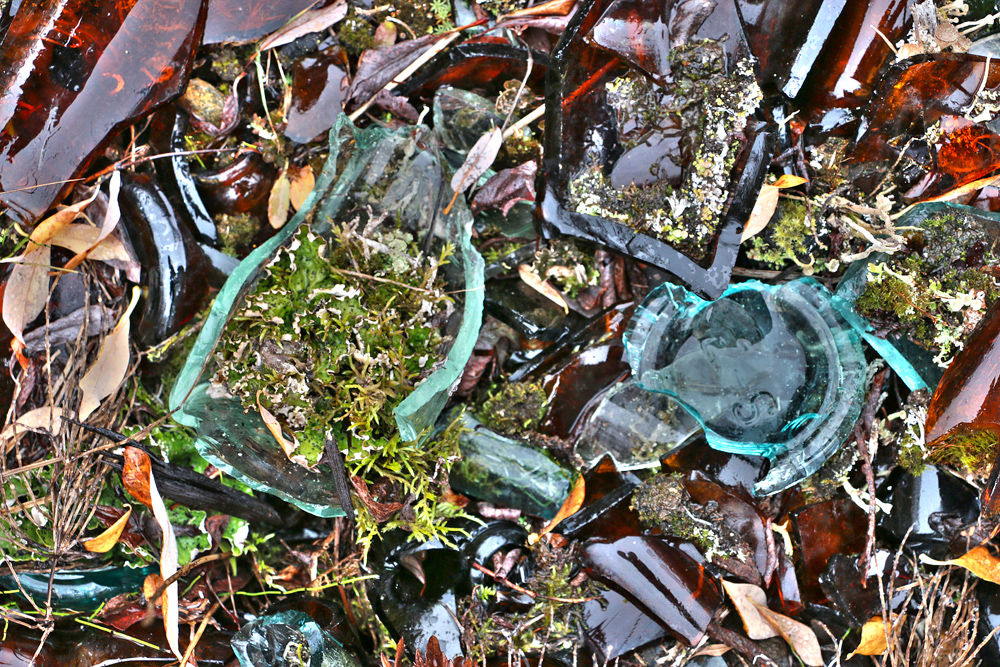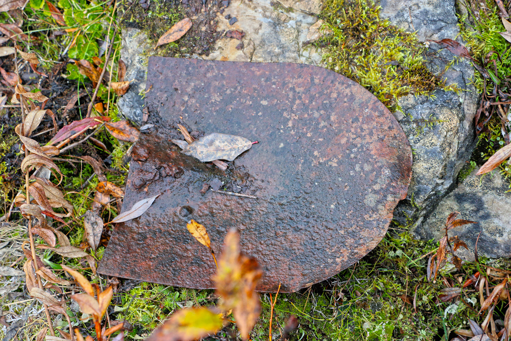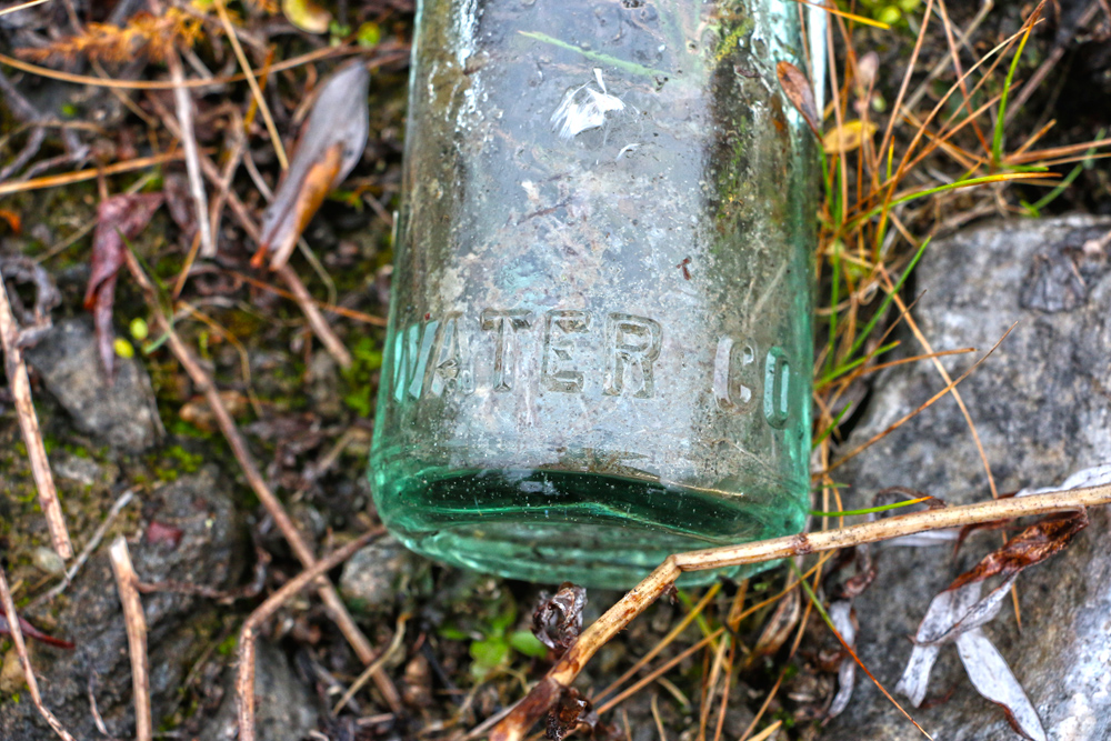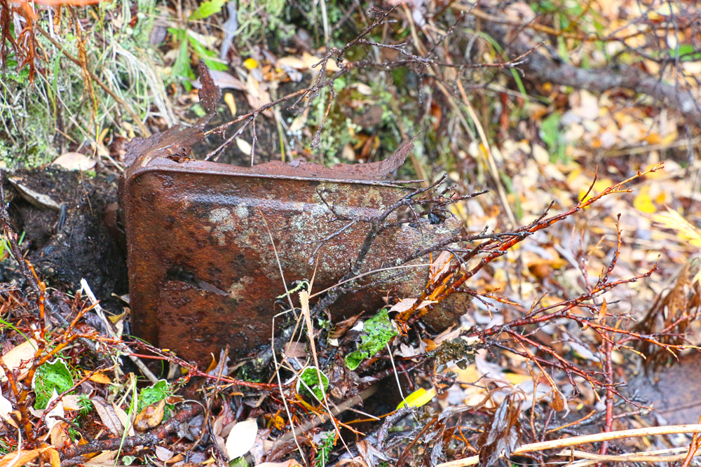 The willows are now grown up around the remains of the building so that no trace of it can be seen from outside the willows. Surrounding the building on three sides, but especially on the uphill side where there was a side door and behind the building are huge mounds that are covered with moss and willows. They look like they could be just part of the hillside. When you walk on these mounds, though, you will hear the crunch of glass under the moss. These mounds are formed from thousands of bottles. Scattered around are old tins, stove parts, shovels with the handles rotted away, steel wash basins and tubs, cigar tins, broken china, etc.