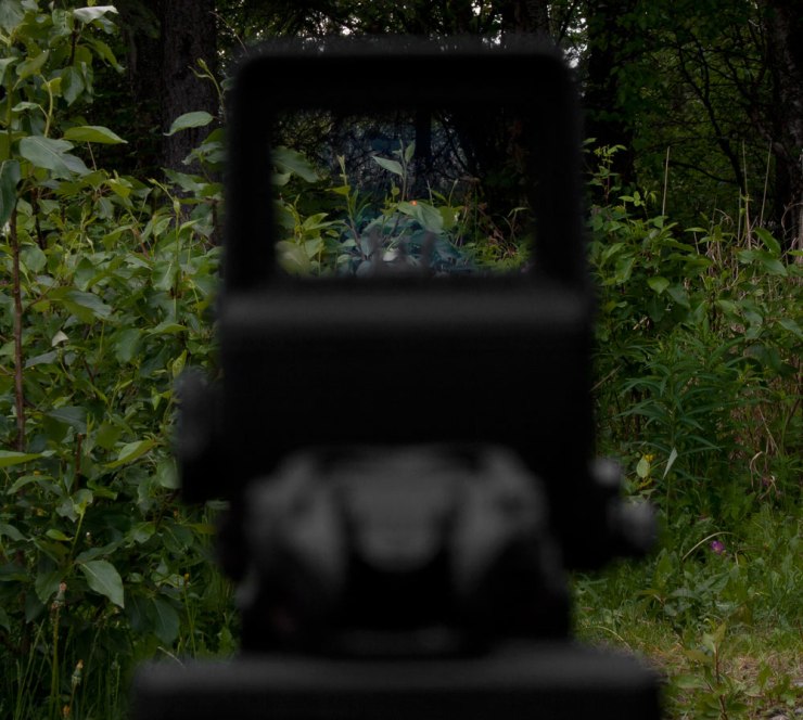 Mepro TRU-DOT RDS view through sight with reticle at lowest daylight setting
